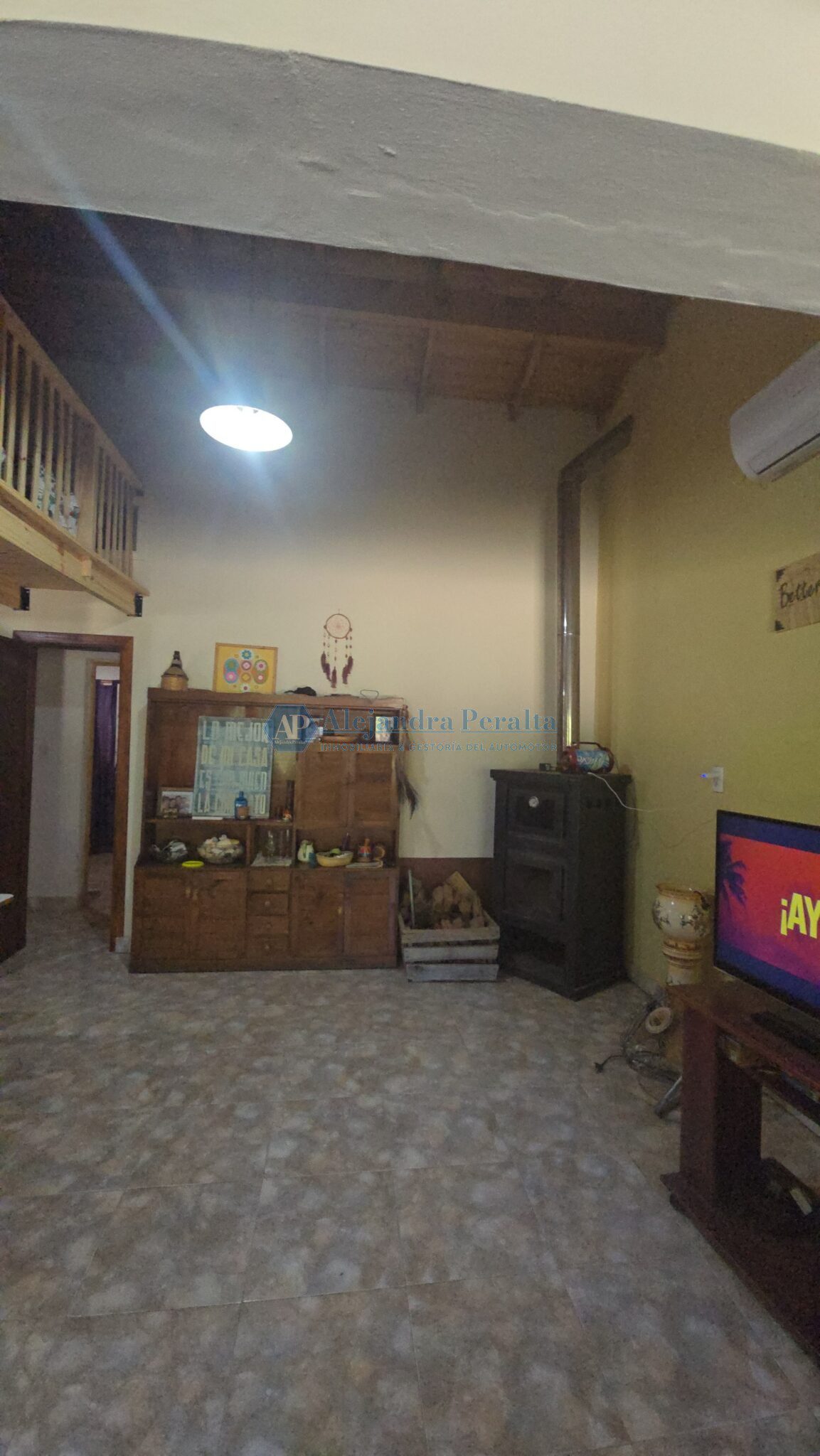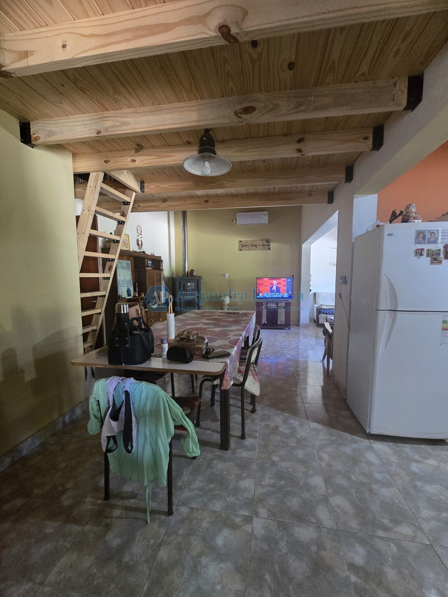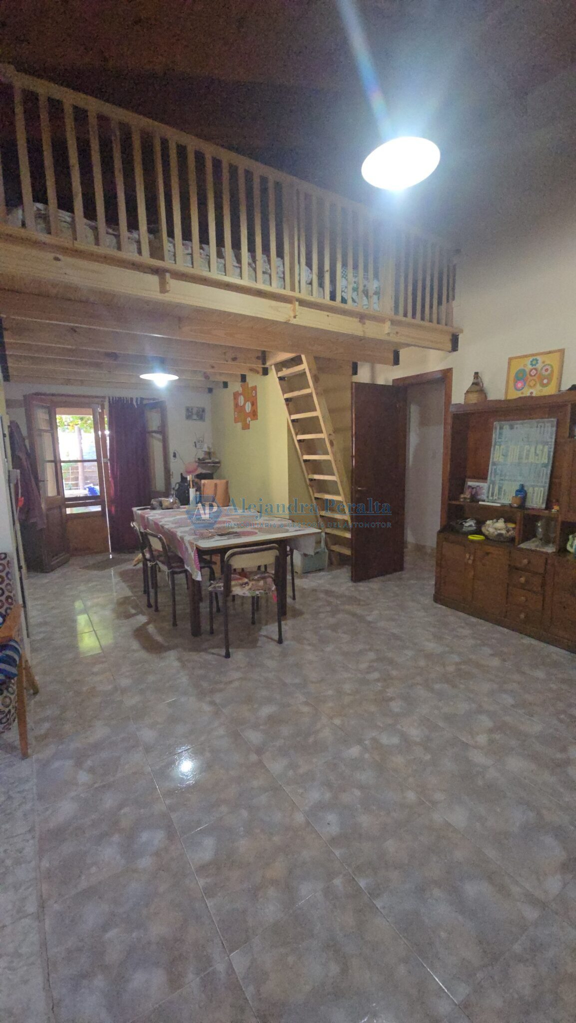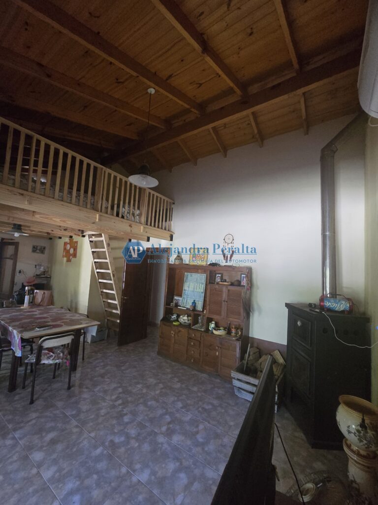 Un ambiente integrado de living-comedor cocina con un entrepiso de madera