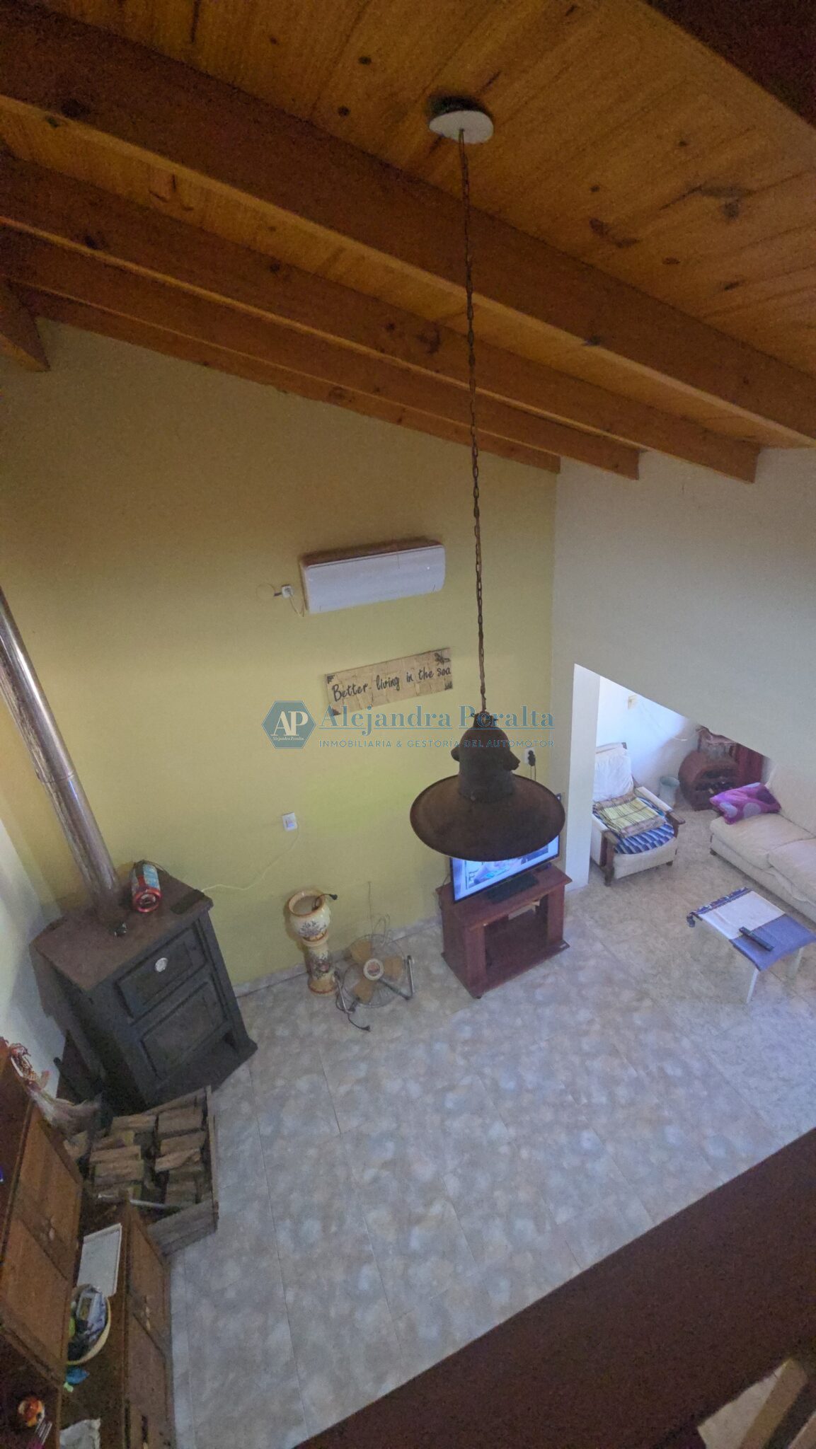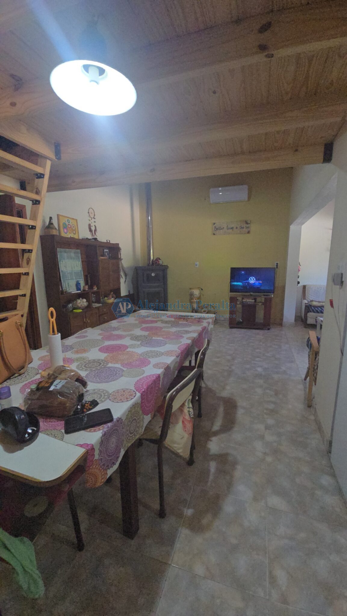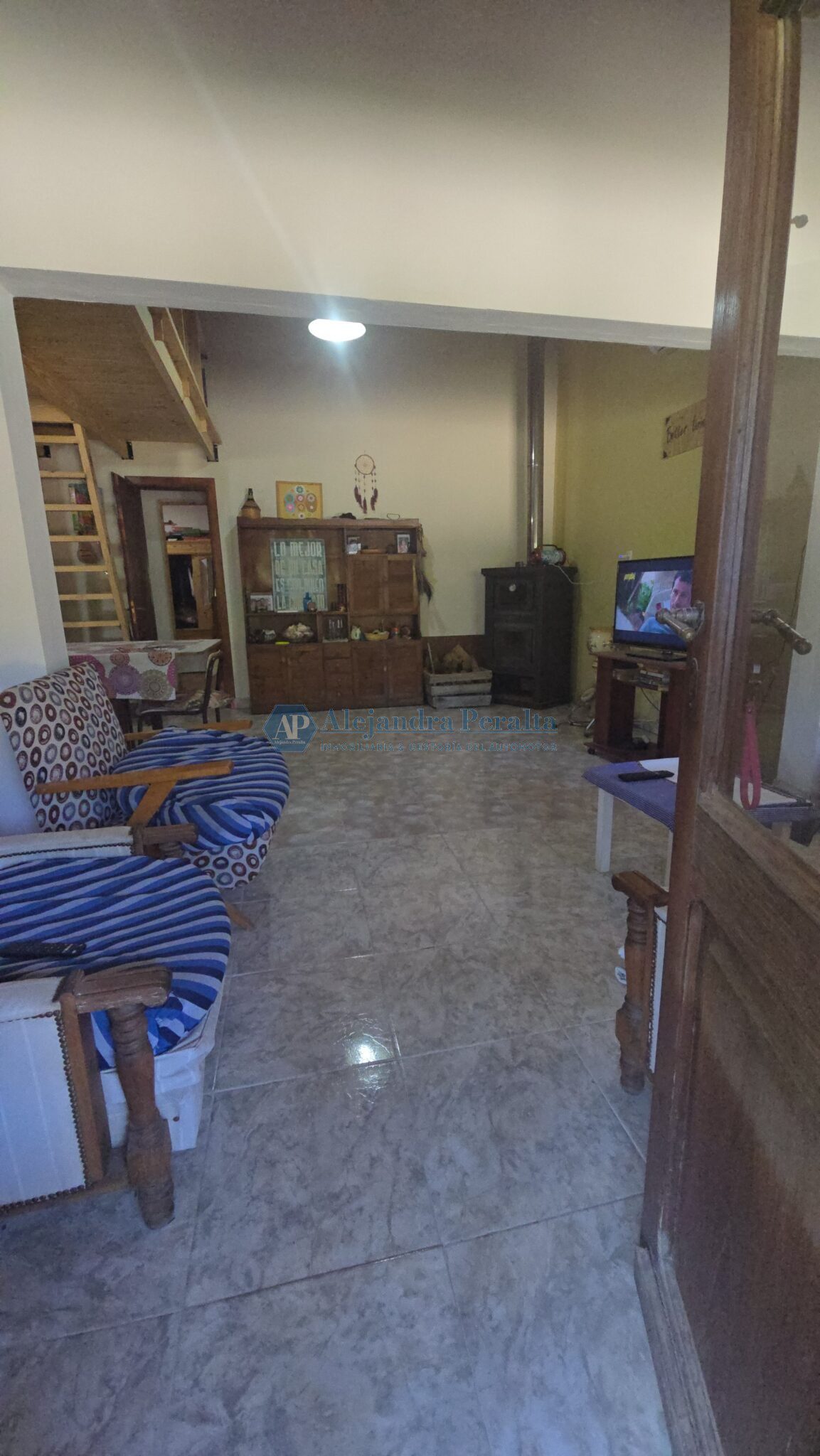 Un ambiente integrado de living-comedor cocina con un entrepiso de madera